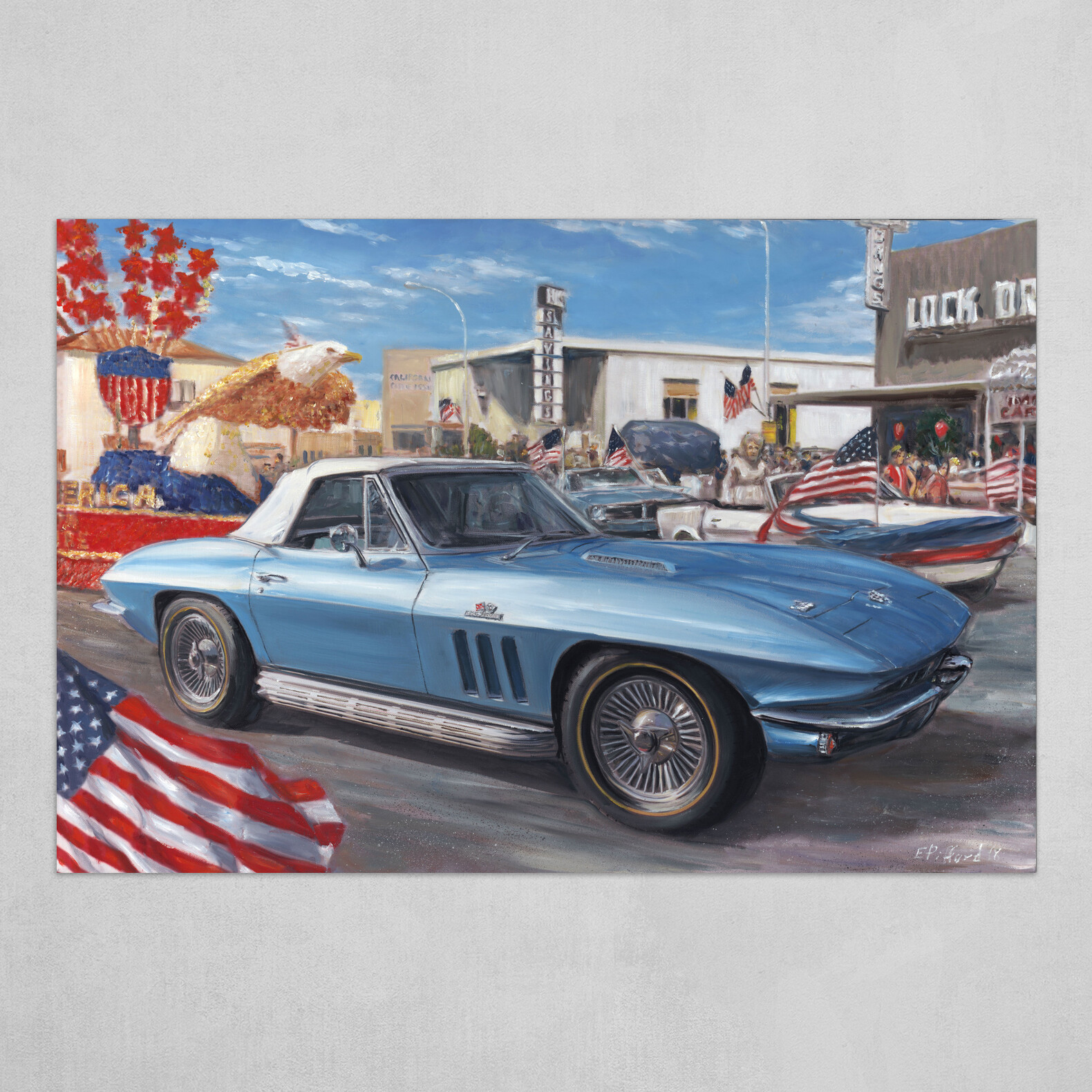 The 1966 Chevrolet Corvette “Sting Ray” was part of the second generation (C2) design of the venerable sports car which lasted from 1963-1967. The exterior was designed by Bill Mitchell’s design team and evolved from the 1957 Q-Corvette concept car, Mitchell’s own racing Sting Ray, the Jaguar E-Type and a Mako shark. The final fiberglass exterior was designed by Larry Shinoda under the direction of Mitchell. Side pipes and a convertible top were options. 1966 saw the introduction of the “big block” 427 cubic inch engine with 430 horsepower and 460 pound feet of torque although the real output was probably as much as 450 horsepower. This was done to make insurance companies less nervous about insuring the vehicle and to allow the Corvette to qualify for lower horsepower and weight brackets in the NHRA drag racing series. The combination of a lightweight design, an independent rear suspension among other suspension components, along with four wheel disk brakes, made the 1966 Corvette 427 Sting Ray a formidable machine.